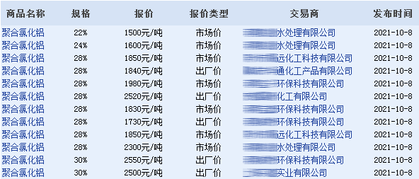 截至到2021年10月8日,據生意社大宗數據價格顯示,工業級固體聚合氯化鋁含量22%報價1500元/噸;含量24%報價1600元/噸;含量28%報價1730~2520元/噸;噴霧型含量30%報價2550元/噸。網絡報價只作參考,真實性無從核實,不作最終購買依據,以當天供應商報價為準!